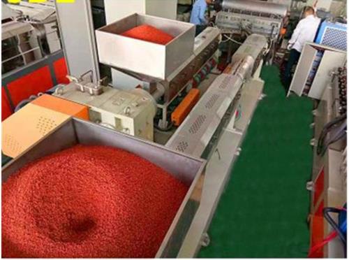 - 原材料準(zhǔn)備:TPV(熱塑性硫化橡膠)顆粒狀的原材料被加入到擠出機(jī)的料斗中。這些原材料是生產(chǎn)塑膠跑道的基礎(chǔ)物質(zhì),其性能和質(zhì)量對(duì)最終產(chǎn)品的品質(zhì)有著重要影響。